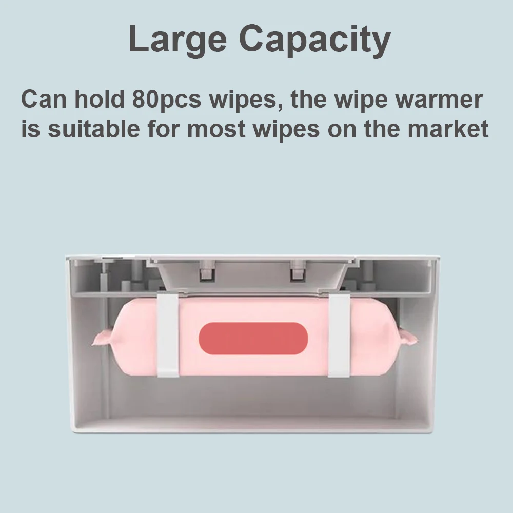 Large capacity, holding 80pcs wipes, the wipe warmer is suitable for most wipes on the market. Quickly heat the top 4-5 wipes, and the bottom wipes can keep fresh.