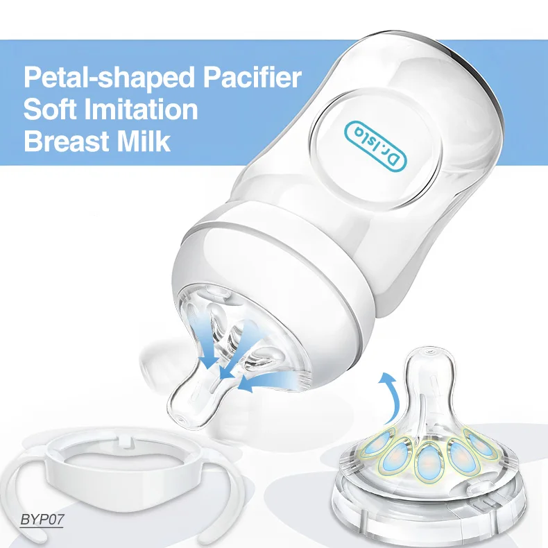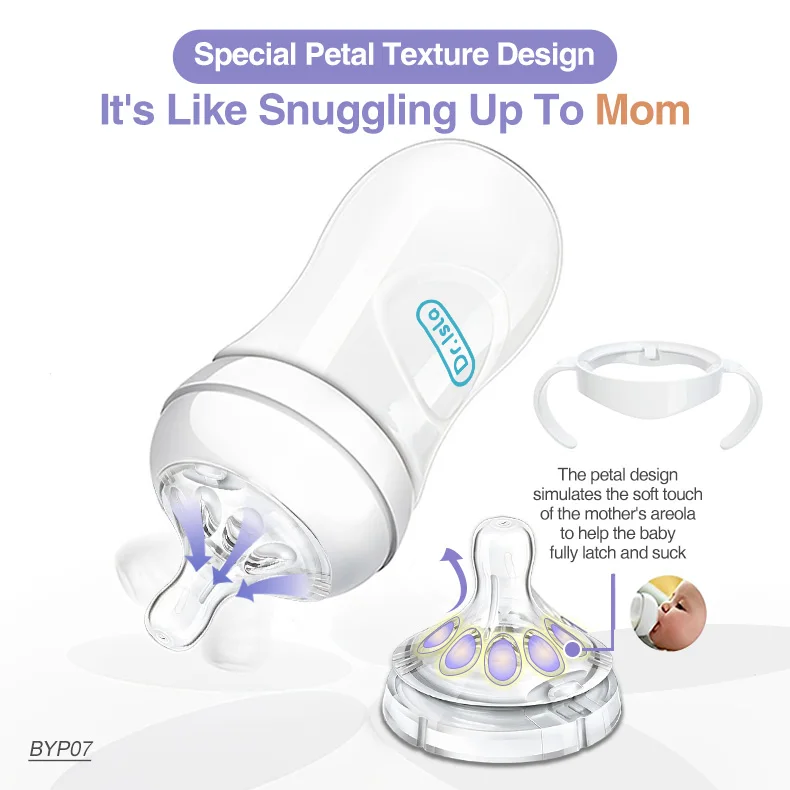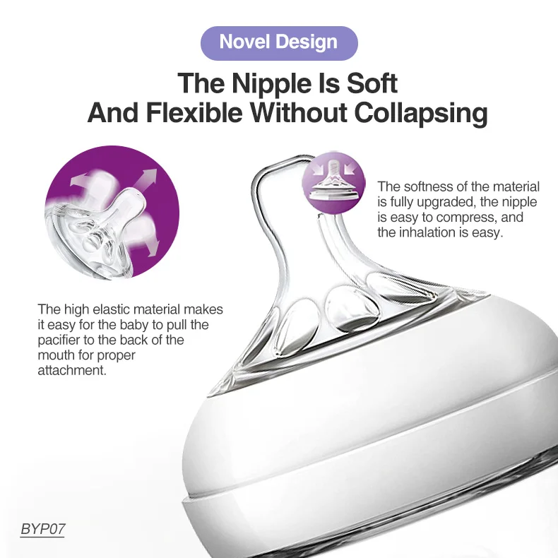 Bottles comes with skin soft material nipple and flexible spiral design, more closely resembles the breast. The comfort petals and natural nipple shape allows natural latch on and makes it easy to combine breast and bottle feeding.